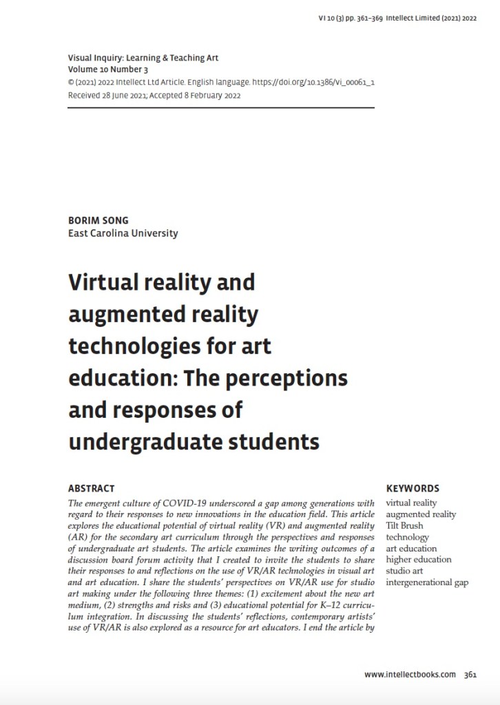 This new article has just been published!Song, B. (2022). Virtual reality and augmented reality technologies for art education: The perceptions and responses of undergraduate students. Visual Inquiry: Learning and Teaching Art. https://doi.org/10.1386/vi_00061_1