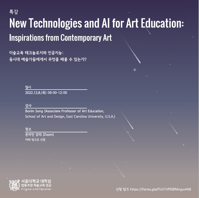 I gave a guest speaker lecture to Masters and Doctoral students in the Art Education program at Seoul National University via Zoom on Dec. 8, 2022, upon the request from Dr. Hyungsook Kim at College of Fine Arts, SNU.