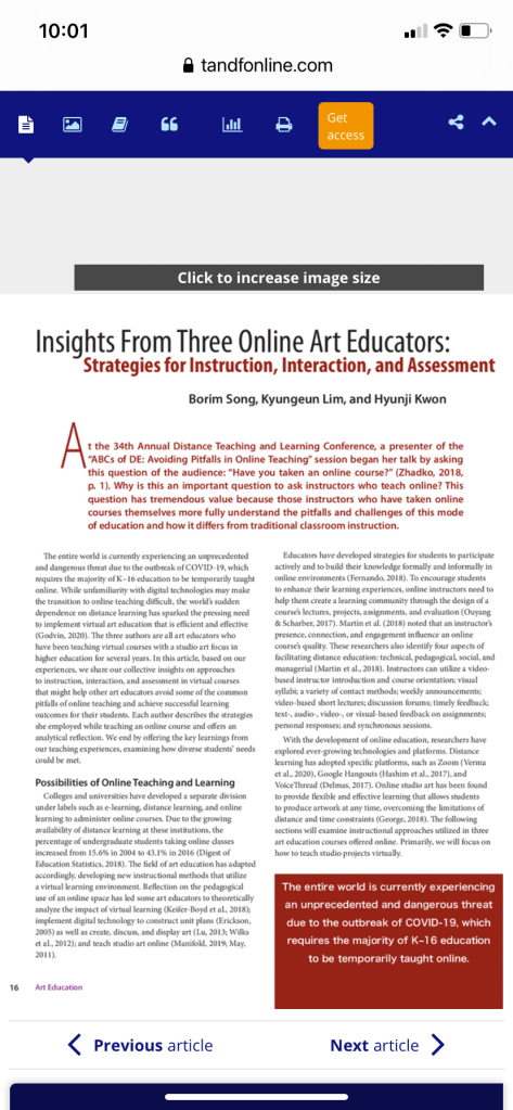 My collaborative article “Insights From Three Online Art Educators: Strategies for Instruction, Interaction, and Assessment” (with Drs. Lim and Kwon) has been published in Art Education: